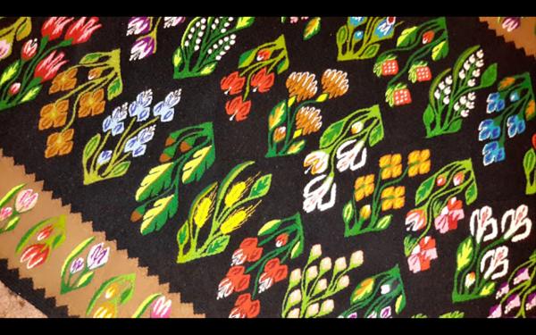 Covor tesut manual cu urmatoarele dimensiuni: 100cm x190cm. Este un covor mai gros, pe fond negru,cu flori de diferite culori.
