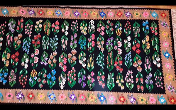 Covor tesut manual cu urmatoarele dimensiuni: 120cm x250cm. Este un covor mai gros, pe fond negru,cu flori de diferite culori.